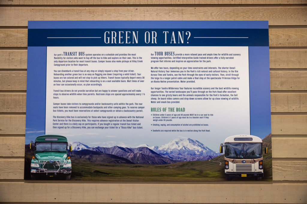 Denali’s green transit buses are lower-cost ($33.50/adult and free for kids under 16), non-narrated buses designed for visitors who want to explore the park independently. These buses are popular with anyone who prefers to hop on and off as they please and doesn’t need the full tour guide experience.