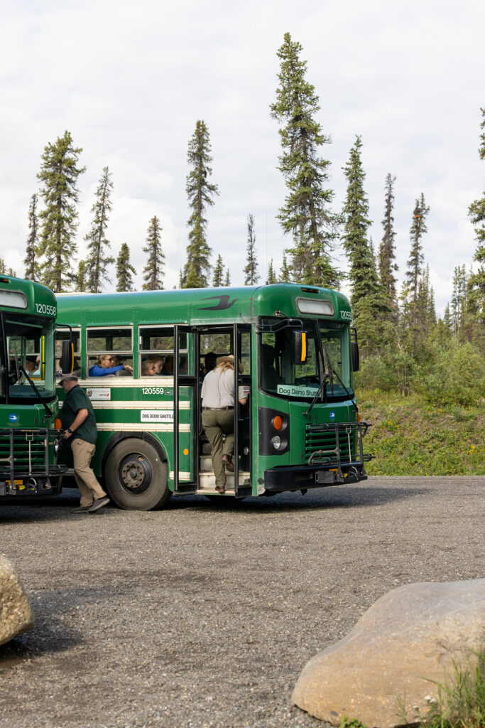 The Sled Dog Tour Shuttle runs 3 times a day, 40 minutes before the sled dog demonstrations. Multiple buses come to shuttle visitors from the visitor center to the sled dog area. These buses arrive 20 minutes before the demonstration and stay 20 minutes after, giving you plenty of time to visit the dogs without rushing in and out.